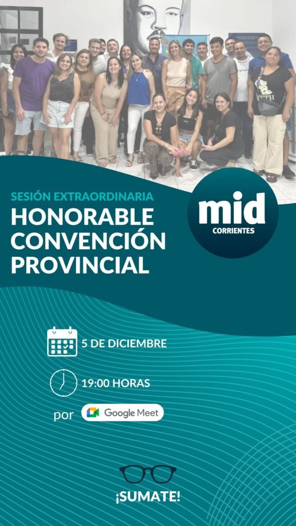 La Mesa Ejecutiva del Comité Central del Movimiento de Integración y Desarrollo (MID) – Distrito Corrientes hizo la convocatoria oficial a una sesión extraordinaria de la Honorable Convención Provincial (HCP) con una publicación en el Boletín Oficial el pasado 1 de diciembre. La reunión está programada para celebrarse de forma virtual, el viernes 5 de diciembre de 2025, a las 19:00.